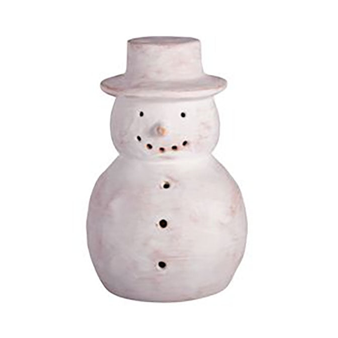 White-washed terracotta snowman with pierced holes features hollow base to fit over flameless tea light.