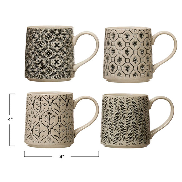 4" Round x 4"H 16 oz. Hand-Stamped Stoneware Mug w/ Embossed Pattern, Cream Color & Black, 4 Styles