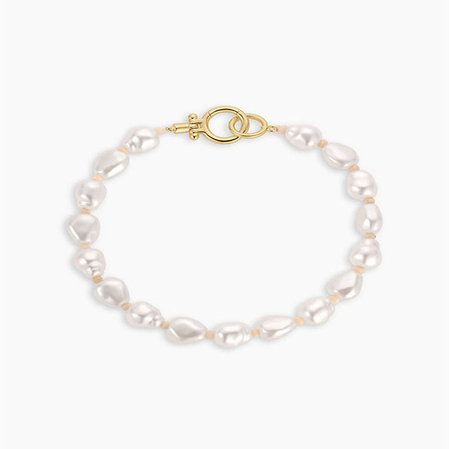 Equal parts playful and polished, this pearl bracelet is those who aren't afraid to make a splash. With its statement silhouette, this bracelet can easily be worn alone, or stacked with your favorite gold and 18k gold plated bracelets.