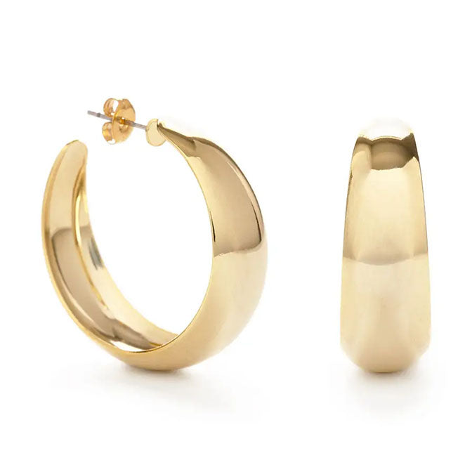 These lightweight, easy to wear large, chunky, vintage hoops were created with the original molds from the 70's. We offer them in 1.25" diameter and 1" diameter for a slightly more conservative look. They are made of 14k gold plated brass or silver plate + coated to prevent tarnish. Surgical steel posts. Genuine American Vintage..