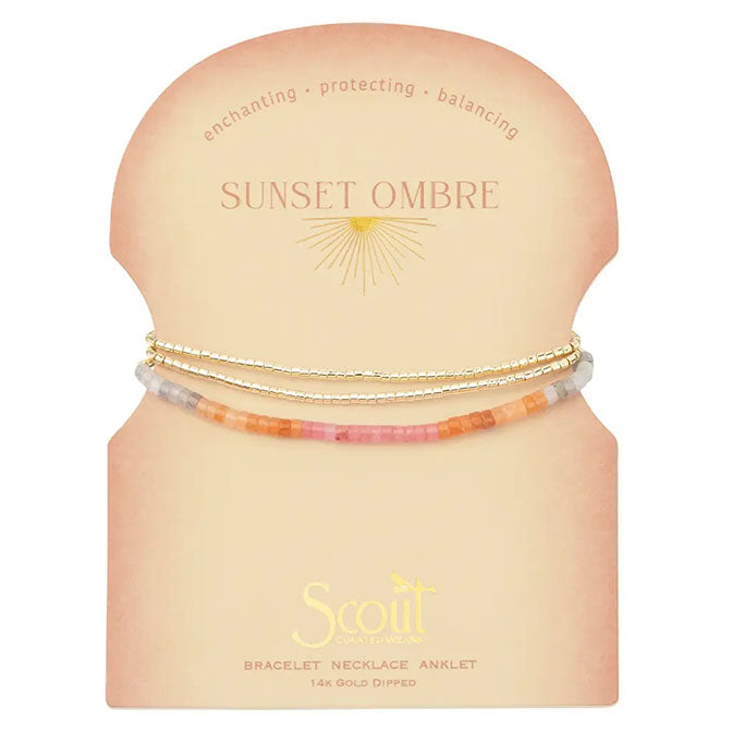 Strung with gracefully gradient semi-precious gemstones. Our newest wrap is made to embellish the wrist, ankle or neckline. • 20" length • Materials: Semi-precious Gemstones, Hematite Plated Beads, 14K Gold or Sterling Silver Dipped Brass, Stretch Cord • Stones: Amethyst, Jade • Presented on recycled cards that tell the meaning of each stone. Enchanting, Protective, Balancing