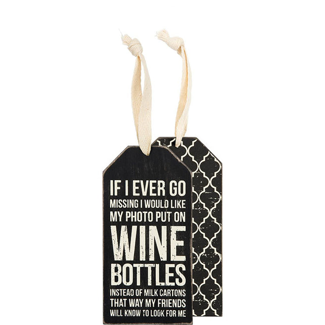 Classic black and white wooden bottle tag featuring distressed "If I Ever Go Missing I Would Like My Photo Put On Wine Bottles Instead Of Milk Cartons - That Way My Friends Will Know To Look For Me" sentiment with reverse tile designs. Top fabric loop for attaching to a bottle of wine.