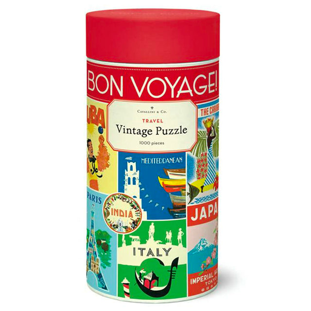 This beautiful 1000 piece jigsaw puzzle features Cavallini’s travel the world artwork. The puzzle is packaged in a 10 inch long cardboard tube, with puzzle pieces safely stored in a muslin bag inside. Finished puzzle measures 22 by 28 inches.