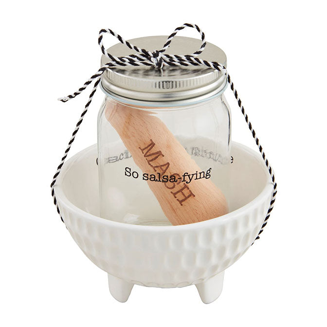 3-piece set. Dimpled ceramic guacamole bowl comes with glass salsa jar and wooden muddler.