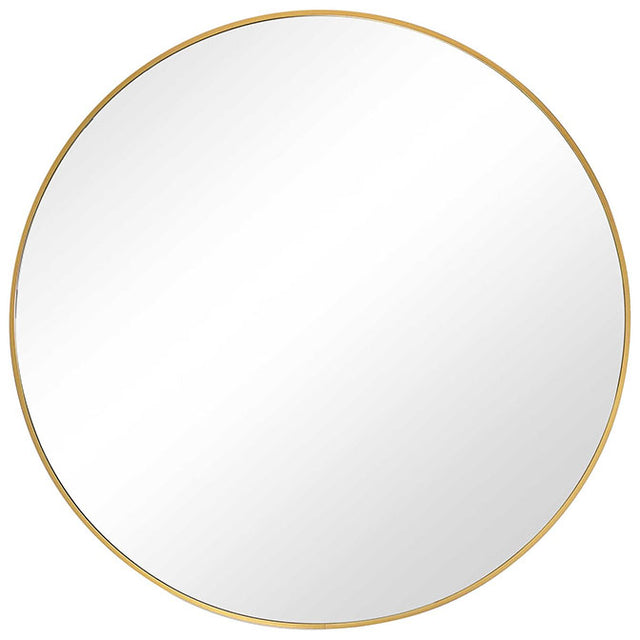 This 34" round mirror, made of aluminum, is finished in a brushed gold. Whether you are updating a foyer or a bathroom, the simple, clean design will give any space a refreshed look.