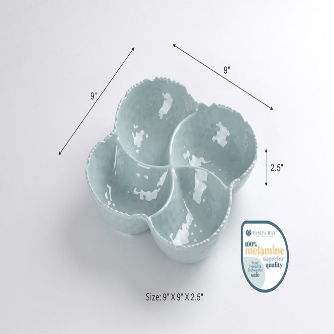 4 Section Bowl in our Ocean Collection. Great for appetizers, tapas, and antipasto. Or use for toppings for a make your own sundae, taco, or pizza night ? the options are endless! Stunning blue-toned superior quality melamine. Great for your indoor and outdoor activities. Food safe, freezer safe, dishwasher safe, Easy Care.