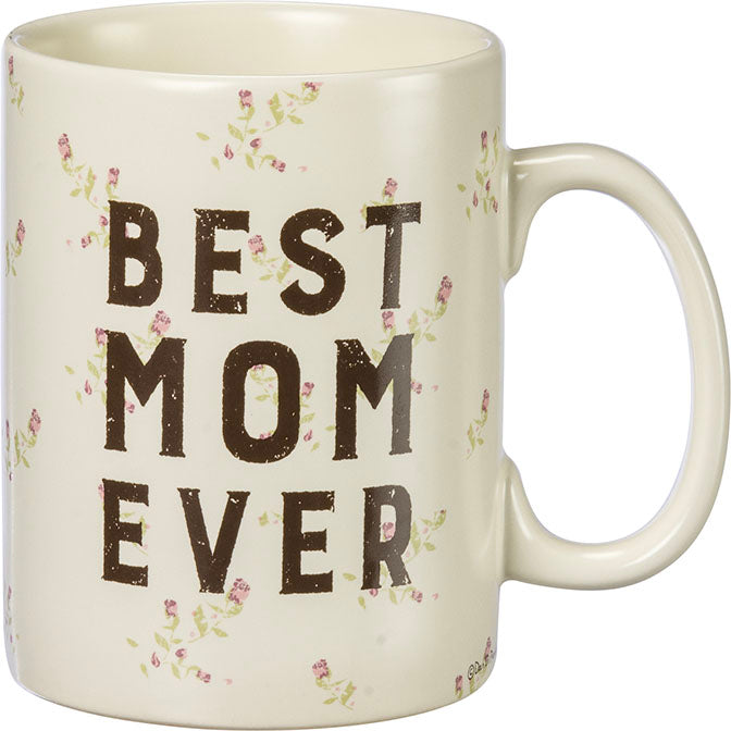 A stoneware coffee mug lending a double-sided "Best Mom Ever" sentiment with floral background print. Complements well with coordinating design pieces for a cohesive gift set or display. Microwave, oven, dishwasher, and food safe; holds 20 oz.