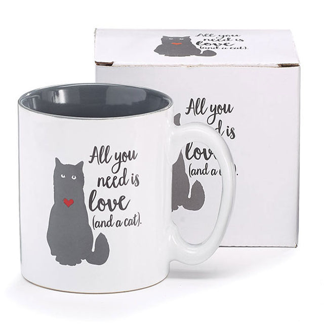 Ceramic mug with dark gray interior and gray cat with "All You Need Is Love (And A Cat)" message. Individually gift boxed.