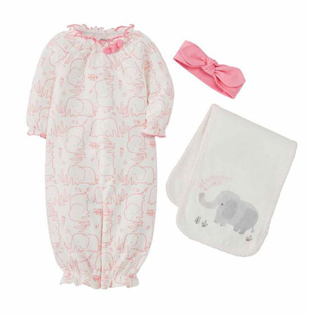 3-piece set. Printed long sleeve jersey convertible gown arrives with coordinating bow headband and printed terry burp cloth.