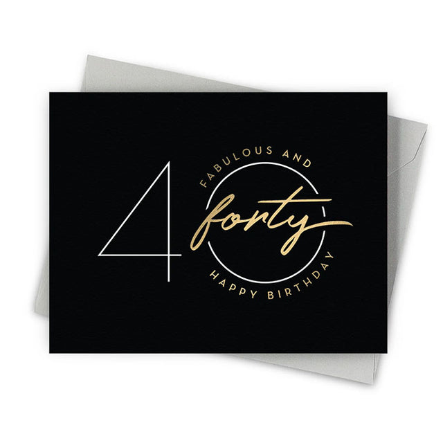 There is no reason that turning forty shouldn’t be a fabulous thing. This modern birthday card comes offset printed and foil pressed in gold, complete with a coordinating gray euro flap envelope.