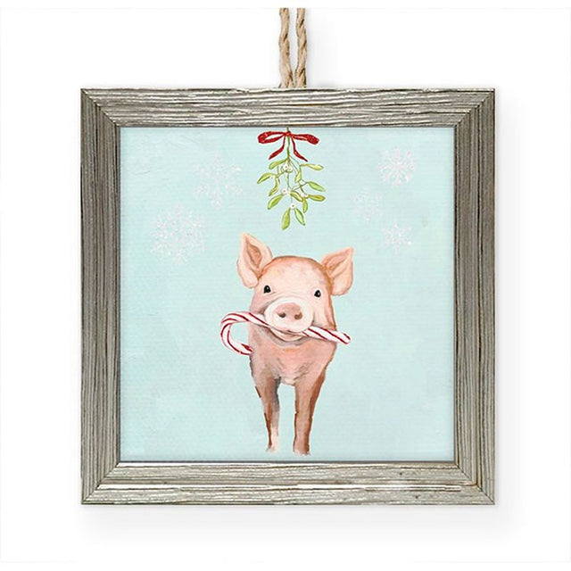 Candy cane in hand - this little pink piggy is easily the life of the party. Shop this and more adorable art from Cathy Walters. 3"x3". Ready to hang with a twine rope loop.