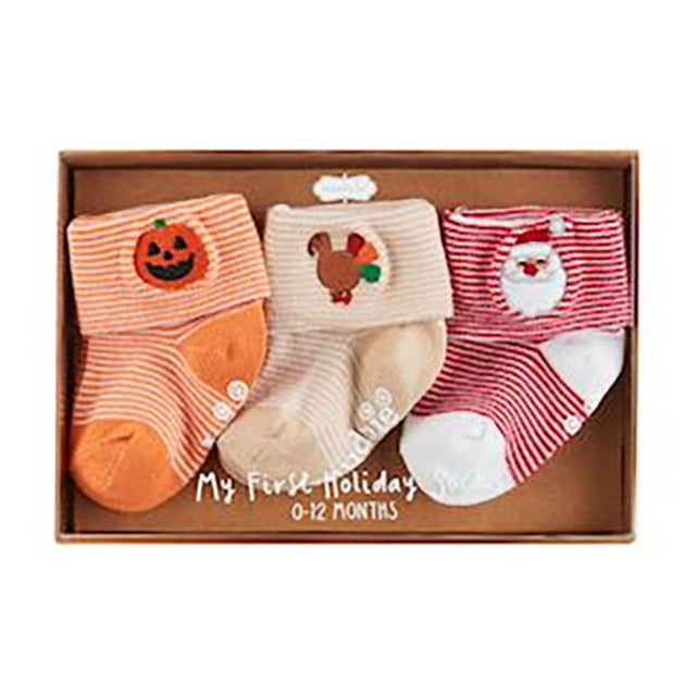 Set of three pairs of cotton hosiery socks feature embroidered Halloween, Thanksgiving and Christmas icons.