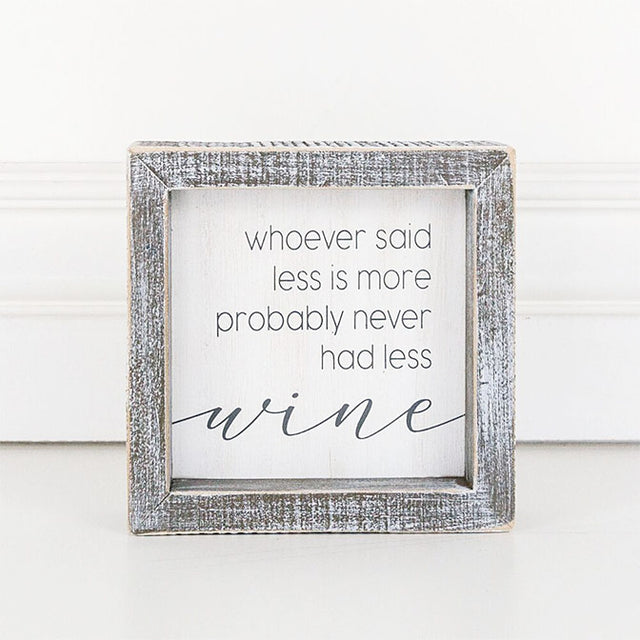A message saying, "Whoever Said Less is More Never Had Less Wine" and can add a positive vibe to your home. It can look great either hanging or freestanding. Using versatile colors of white and grey, this wood sign complements well with a wide range of home and office decors.