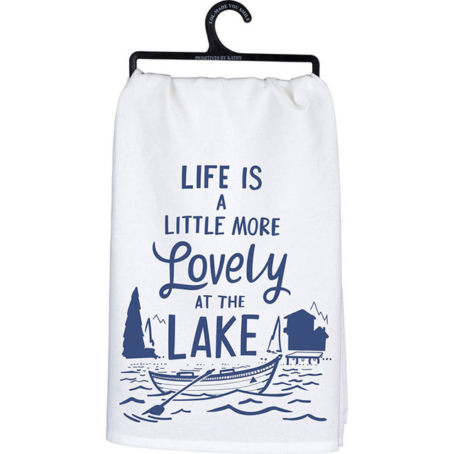 A black and white cotton kitchen towel featuring a "Life Is A Little More Lovely At The Lake" sentiment with scenic canoe and lake designs. Machine-washable.
