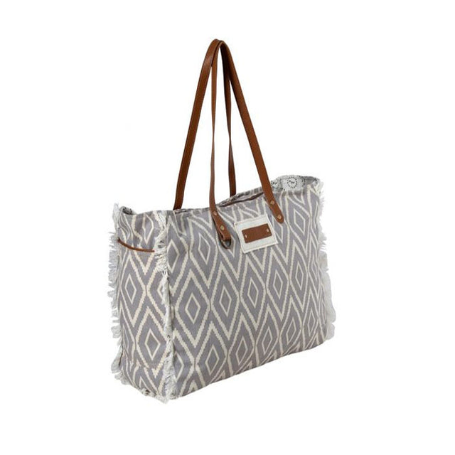 The woven canvas of this exceptional bag features a striking tribal-inspired pattern in soothing gray and white colors. Frayed edge treatments complete the look. Zipper close top keeps everything secure. Features durable leather carrying straps in warm caramel leather. A marvelous, stylish bag for all occasions!