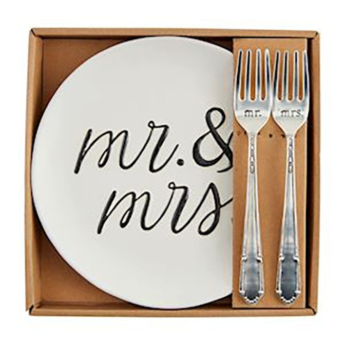 3-piece set. Hand-painted stoneware plate. Comes with two stamped silverplate forks.