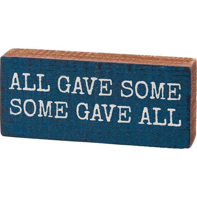 A wooden block sign featuring patriotic "All Gave Some, Some Gave All" sentiment. Natural wood sides make the design pop. Design is replicated from original artwork painted onto burlap canvas, giving the art a unique depth and texture. This God Bless America sign is easy to hang via predrilled keyhole slot or can free-stand alone.