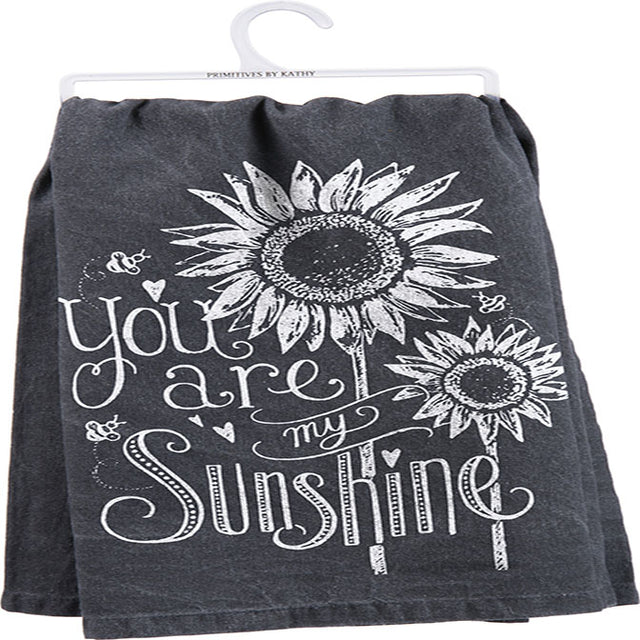 A black and white cotton kitchen towel featuring unique chalk art, hand lettered "You Are My Sunshine" sentiment, and sunflower, bumblebee, and heart designs. Complements well with existing decor or coordinating design pieces. Machine-washable.